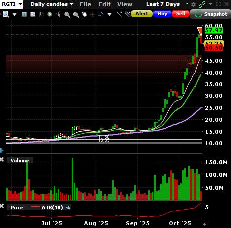 RGTI I had started last week because I thought there was considerable risk of a random big gap down and I wanted to be involved in some capacity. Never added to it because there wasn’t an obvious reason to; it just kept pulling back at the open only to rebid and melt higher for the rest of the day. An obvious signal would’ve been an exhaustion gap or a break of the above-mentioned pattern. We got the latter today and I added. The add was smaller; would’ve much preferred a parabolic extension but I wouldn’t be surprised if they rolled over in the lamest fashion possible. That would at least be the one constant for these names. Didn’t even double down and my average is still pretty trash in the $47.4s. Would add again through daily PBL which it has held for the entire second leg and then use a hard stop at today’s highs. Still pretty small on this at ~25% of a full pos.